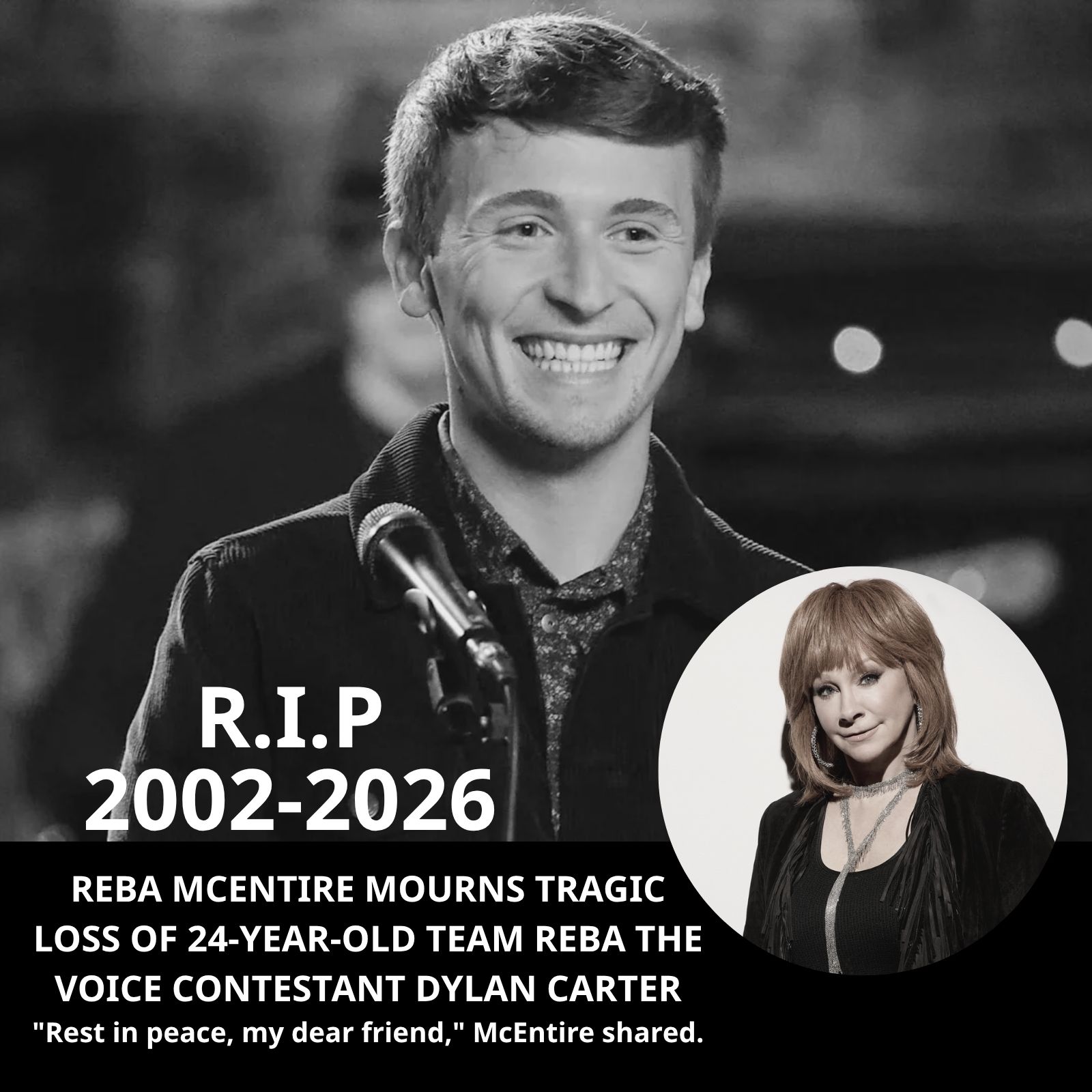 The music world is reeling from a loss that feels both sudden and deeply personal, as Reba McEntire shared an emotional farewell to Dylan Carter, a rising young artist whose journey was only just beginning and whose presence had already left a lasting impression on those who encountered him.