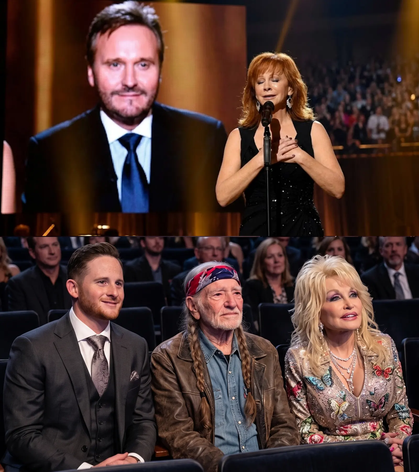 In the crowd, the impact of the moment was visible among those closest to her, particularly her son Shelby Blackstock, who sat quietly, his attention fixed on the stage, while nearby, Willie Nelson lowered his head, his posture reflecting the emotional weight of the tribute.